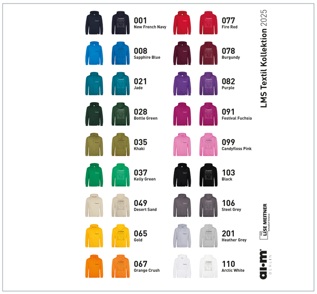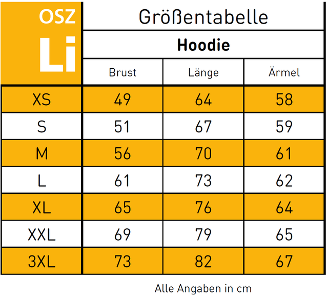 Suchen Sie sich Ihren Hoodie anhand der Farb- und Größentabelle aus.